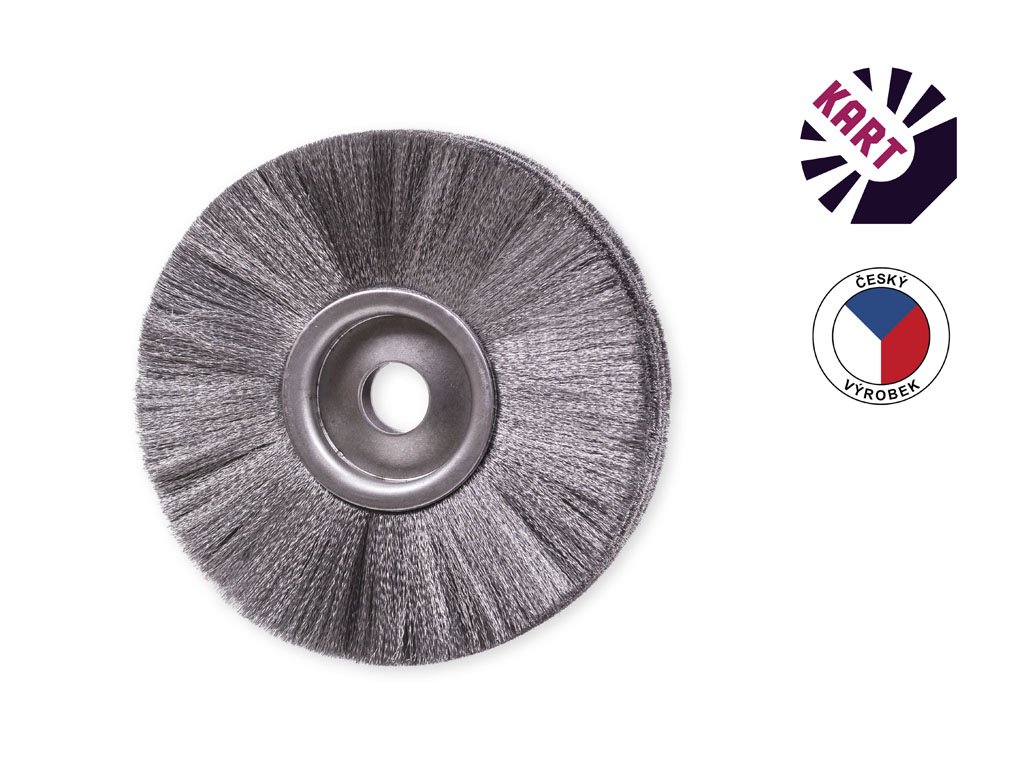 Kotoučový kartáč o průměru 160 mm, osazený vlnitým ocelovým drátem o průměru 0,15 mm, s upínacím otvorem o průměru 20 mm.