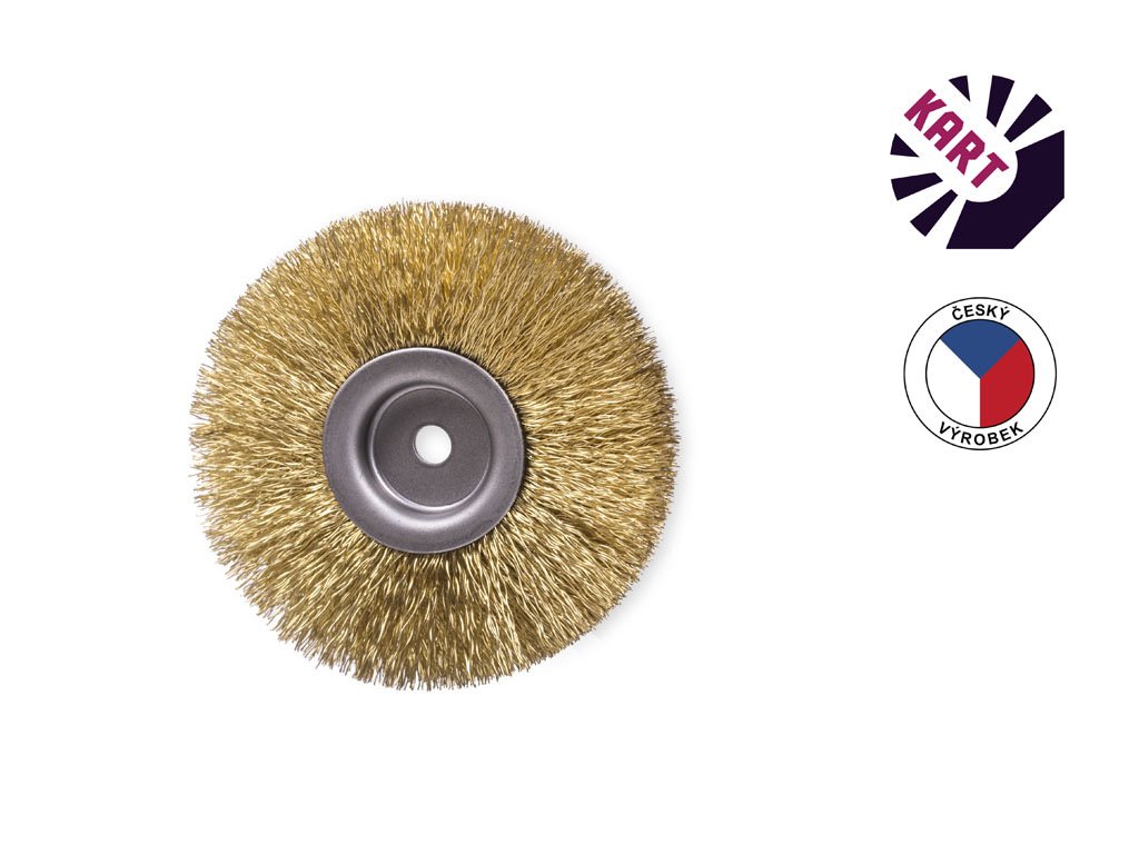 Kotoučový kartáč o průměru 100 mm, osazený vlnitým mosazným drátem o průměru 0,20 mm, s upínacím otvorem o průměru 8 mm.
