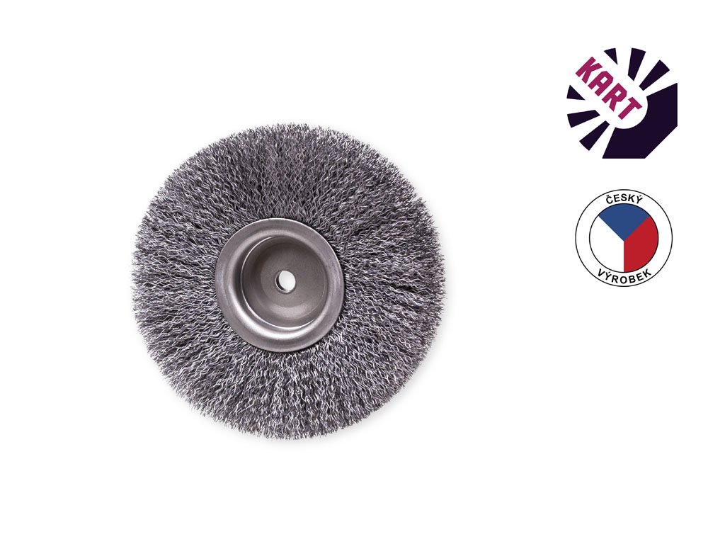 Kotoučový kartáč o průměru 120 mm, osazený vlnitým ocelovým drátem o průměru 0,45 mm, s upínacím otvorem o průměru 8 mm.