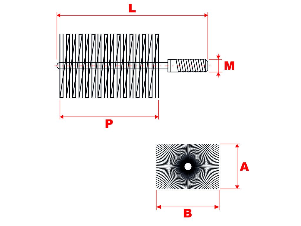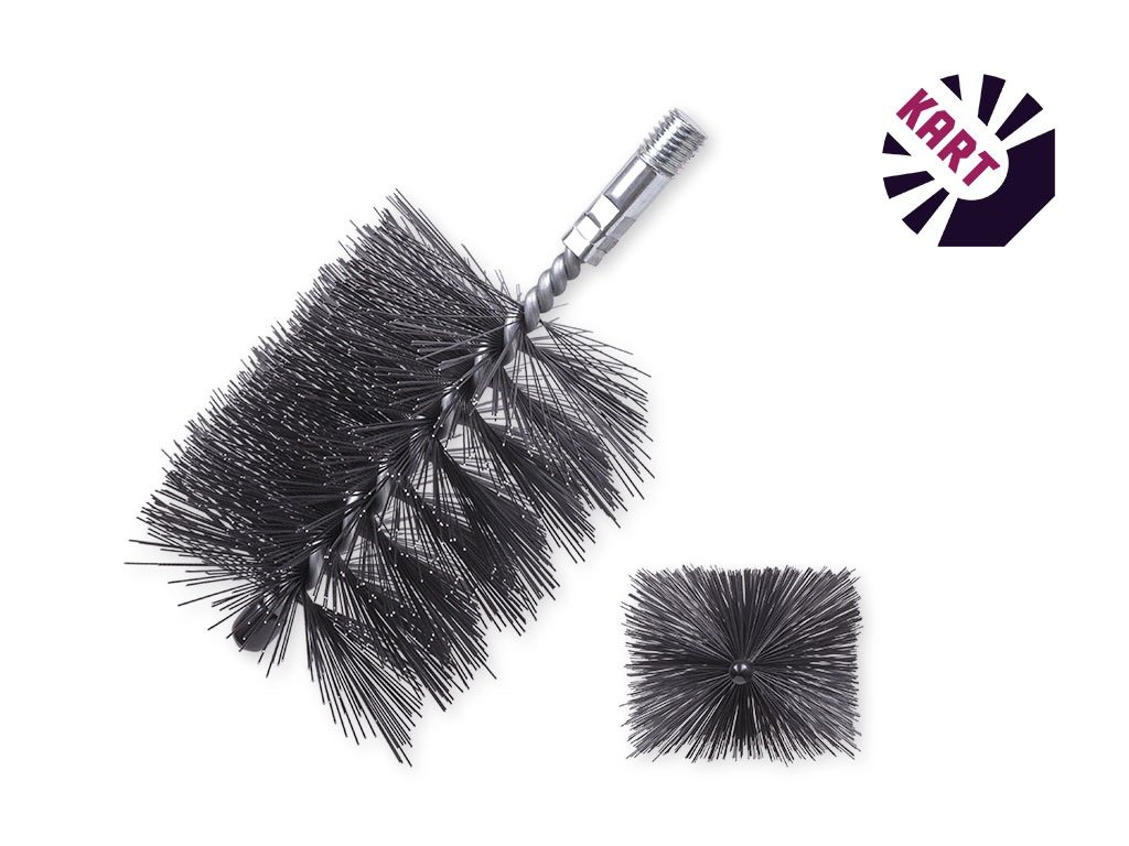 Hranatý rourový kartáč o délce stran 70 mm x 100 mm, závitem M12 je osazen hladkým ocelovým drátem o průměru 0,40 mm.