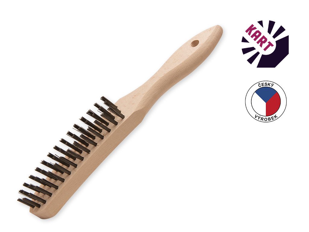 Ruční kartáč se zahnutou dřevěnou rukojetí, osazený hladkým ocelovým drátem o průměru 0,30 mm.