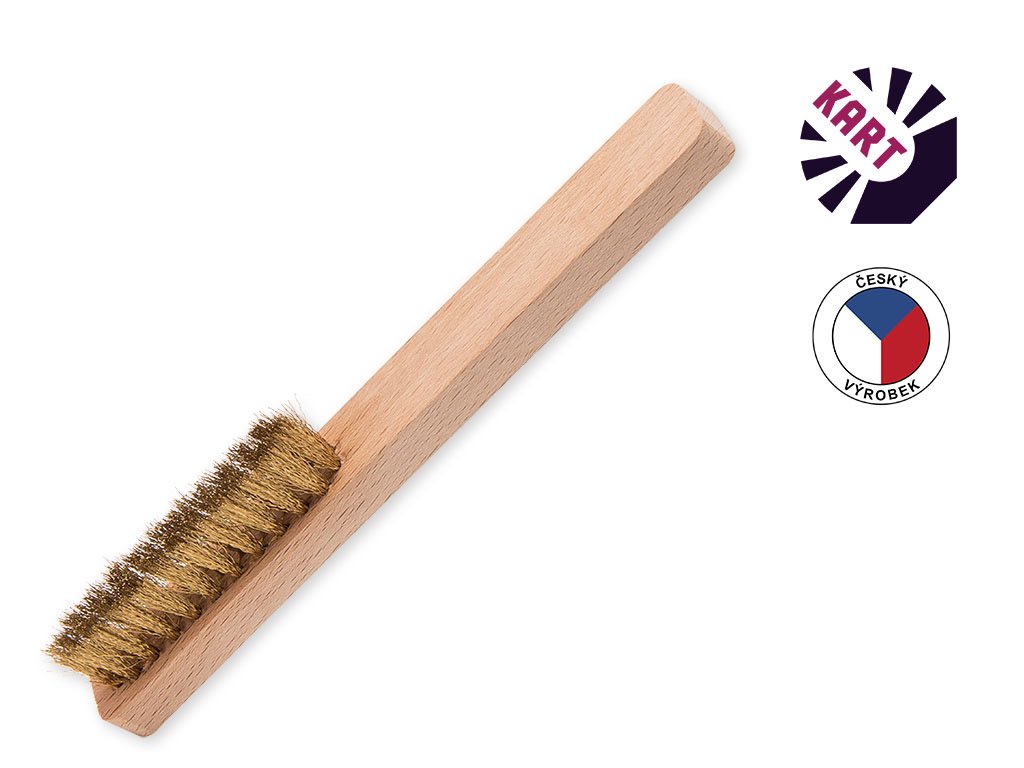 Ruční kartáč s dřevěnou rukojetí, určený především pro hodináře, ale očistíte s ním třeba i autosvíčky. Kartáč je osazený vlnitým mosazným drátem o průměru 0,15 mm ve 3 řadách.