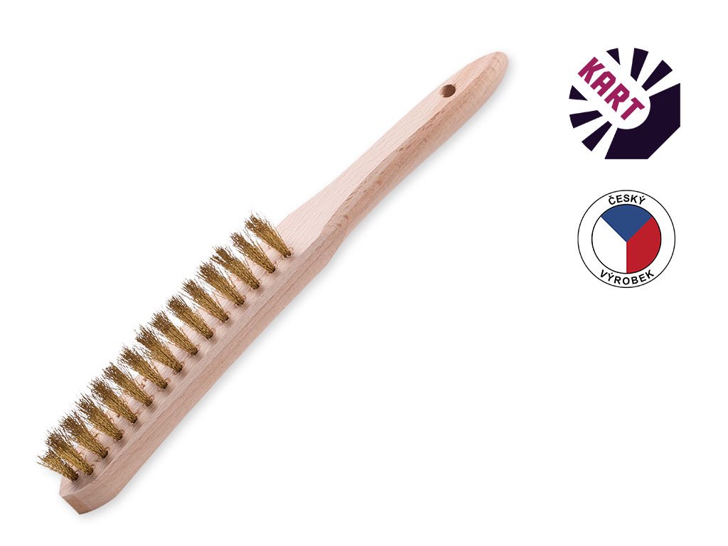 Ruční kartáč se zahnutou dřevěnou rukojetí, osazený vlnitým mosazným drátem o průměru 0,25 mm, ve 2 řadách.