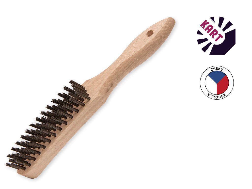 Ruční kartáč se zahnutou dřevěnou rukojetí, osazený polyamidovým (nylonovým) vláknem o průměru 0,50 mm, ve 4 řadách.