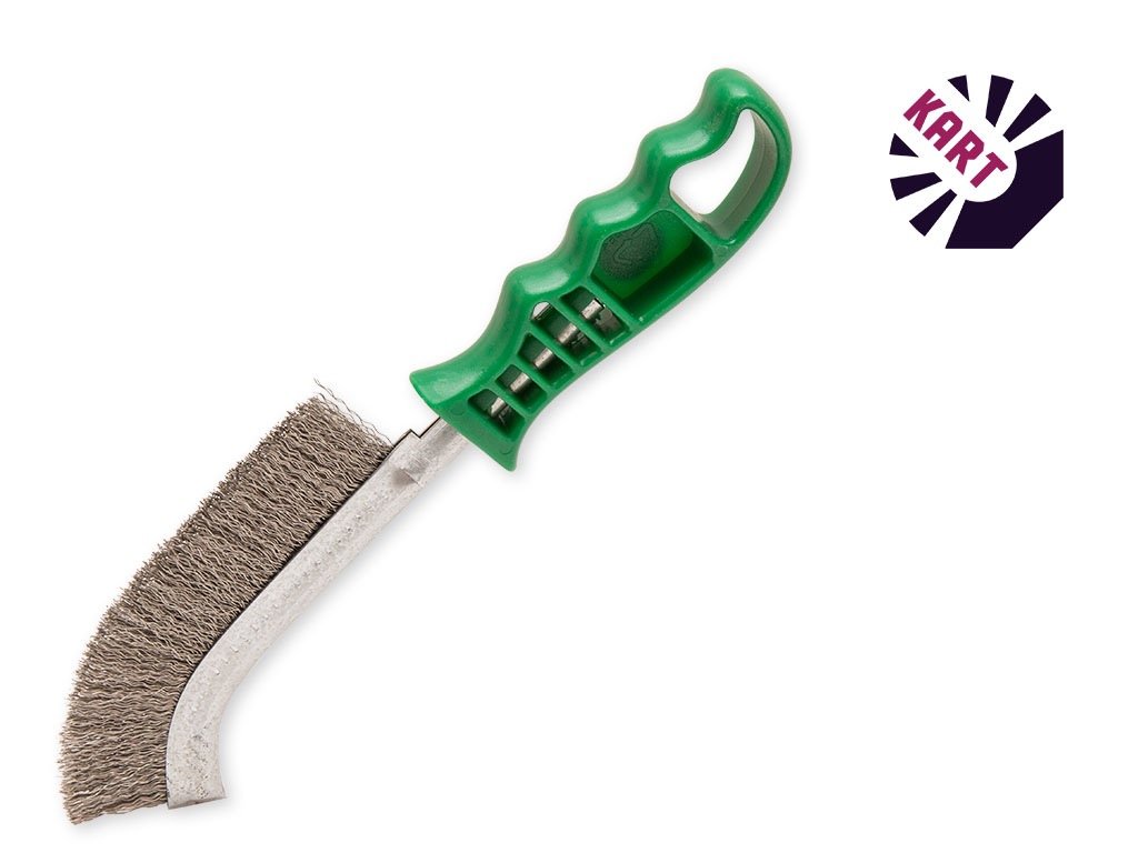 Ruční kartáč lištový, zahnutý s plastovou rukojetí, osazený vlnitým nerezovým drátem o průměru 0,35 mm.